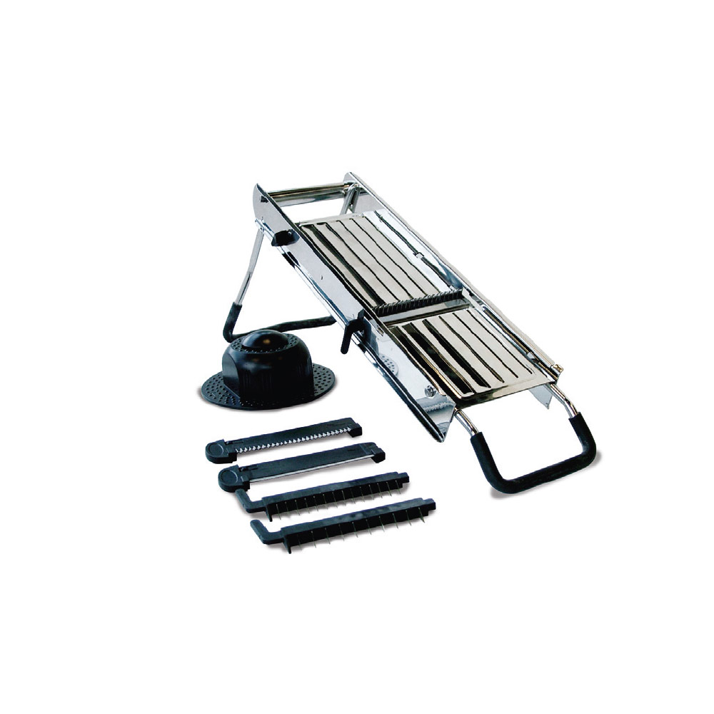 Our mandoline slicer is manufactured with 18/10 stainless steel. The unit comes complete with five interchangeable cutting blades and a plastic hand pusher. The handles and feet are coated with rubber, which provides stability during use. The top levers allow thickness adjustments to 1/2″. The mandoline slicer is designed to slice, waffle, and jullienne cut a variety of fruits and vegetables.