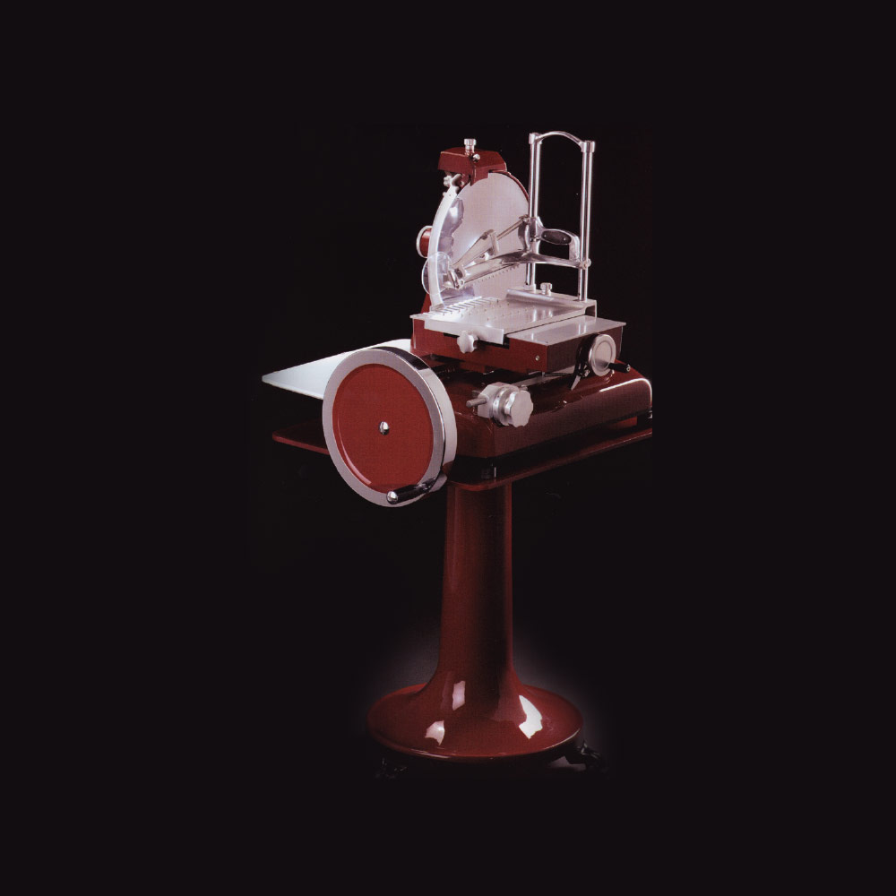 Theses slicers are made of aluminium with steel parts and brilliant red finishing. Our Manual Volano Slicers provides easy maintenance and operation. These units are fully hand-operated. The built-in blade sharpener keeps the blade sharp for efficient cutting. The slicers are equipped with a protection ring around its blade to meet CE standards.. They are designed for durability and consistent slicing. Made in Italy.