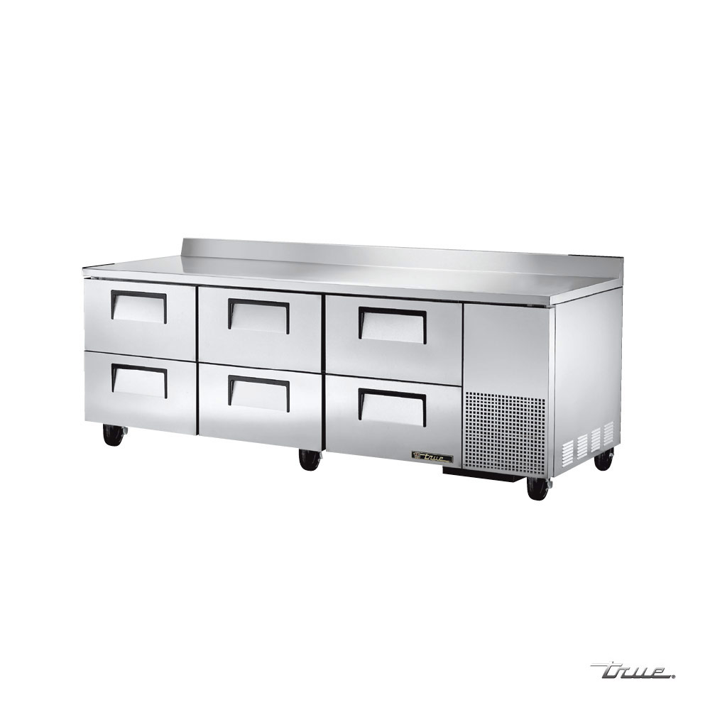 Spec SheetTrue’s deep worktop units are designed with enduring quality that protects your long term investment. True’s deep worktop units feature the combined advantage of convenient worktop prep space with deeper refrigerated storage. Designed using the highest quality materials and components to provide the user with colder product temperatures, lower utility costs, exceptional food safety and the best value in today’s food service marketplace. Oversized, environmentally friendly (134A) forced-air refrigeration system holds 33°F to 38°F (.5°C to 3.3°C). All stainless steel front, top and ends. Matching aluminum finished back. Top and backsplash are one piece formed construction. Bacteria and food particles cannot be trapped underneath as with other two-piece worktop units. NSF approved, white aluminum interior liner. Stainless floor with coved corners. Each drawer accommodates two (2) full size 12″L x 20″D x 8″H (305 mm x 508 mm x 204 mm) food pan (sold separately). Foamed-in-place using Ecomate. A high density, polyurethane insulation that has zero ozone depletion potential (ODP) and zero global warming potential (GWP).
